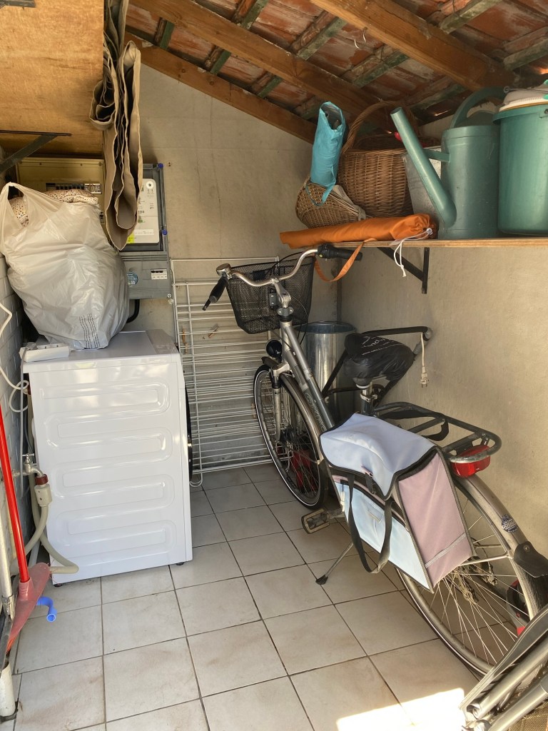 - In de tuinberging staat een wasmachine, twee ligzetels, een houtsbarbeque, een fiets die mag geleend worden en een grote tuinparasol