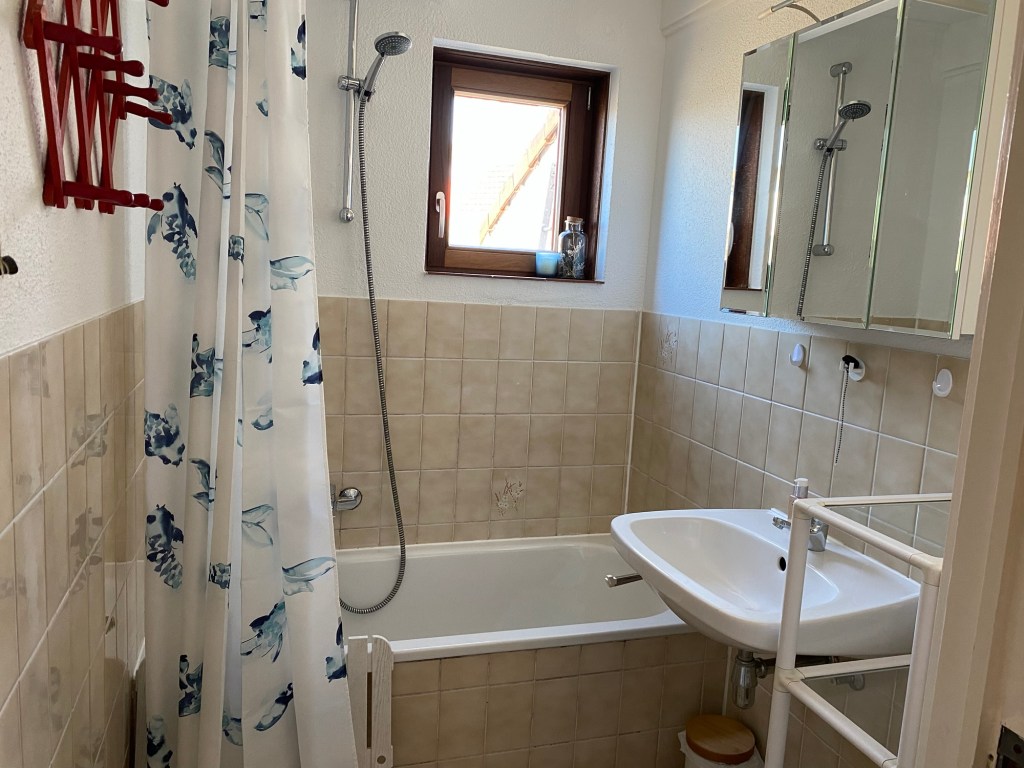 - Badkamer met ligbad en douchescherm